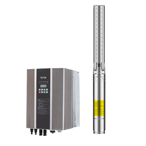 ECCNTECH AC Solar Pump consists of a solar pumping inverter and an AC pump. Solar pumping inverter drives the pump by converting DC power produced by solar array into AC power and adopts patented dynamic VI maximum power tracking (MPPT) algorithm to adjust output frequency according to solar radiation in real time. It has high reliability and an up to 98% conversion efficiency. The maximum water head of ECCNTECHAC Solar Pumps can reach 400m and daily water supply is up 3 to 3000m³.